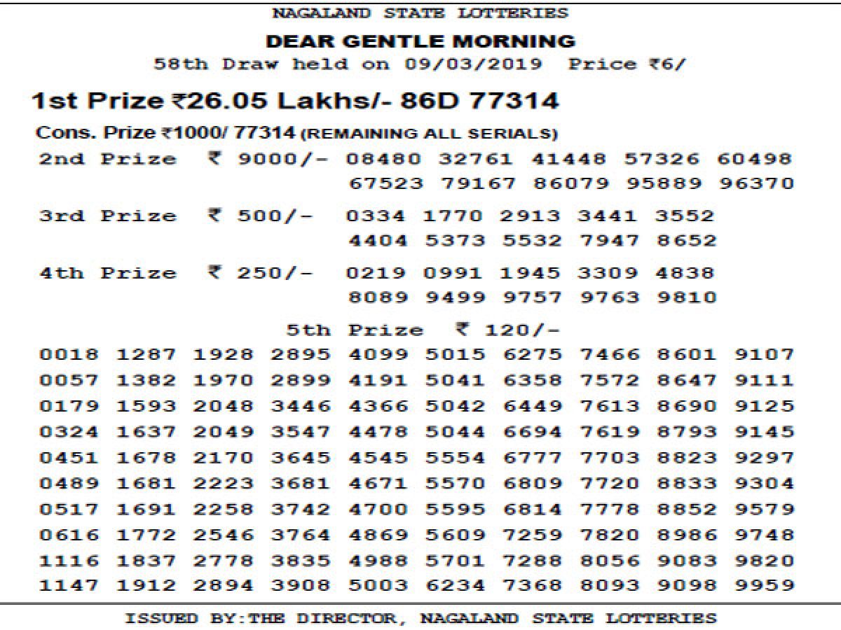 Nagaland Lotteries today results Dear Gentle Morning results check